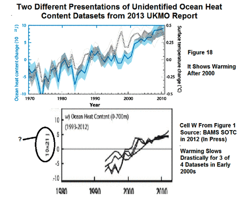 Abbildung 18 aus dem UKMO-Bericht findet sich im oberen Kasten meiner Abbildung 13. Ich habe vieles der Temperaturdaten an Land gekennzeichnet, um die Daten des ozeanischen Wärmegehaltes zu beleuchten. Das UKMO hat den Datensatz des ozeanischen Wärmegehaltes in einer Tiefe von 0 bis 700 m nicht identifiziert; man hat lediglich in der Bildunterschrift darauf hingewiesen, dass der Datensatz der Temperaturdaten an Land der von HADCRUT4 ist. Im Text seines Berichtes bezog sich das UKMO auf Levitus et al. (2012). Aber der obere Kasten in Abbildung 13 (Abbildung 18 im UKMO-Bericht) zeigt nicht den ozeanischen Wärmegehalt von 0 bis 700 Metern. Die NODC-Daten des ozeanischen Wärmegehalts zeigen von den achtziger Jahren bis zu Beginn dieses Jahrhunderts keine Abkühlung, anders als beim UKMO dargestellt.