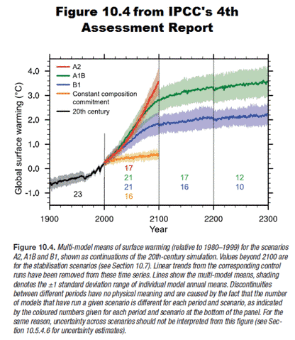 Dann zeigten sie den vorhergesagten Anstieg der globalen Temperatur basierend auf Projektionen des zukünftigen Antriebs durch Treibhausgase. Dies haben sie illustriert in Abbildung 10.4 im AR4, die hier als Abbildung 2 reproduziert wird: