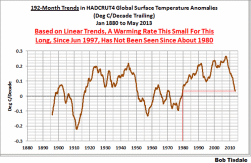 Zweitens, die öffentliche Aufmerksamkeit für den Stillstand der Erwärmung schoss in die Höhe mit dem Artikel von David Rose in der Daily Mail mit dem Titel “Global warming stopped 16 years ago, reveals Met Office report quietly released… and here is the chart to prove it” [etwa: die globale Erwärmung hat vor 16 Jahren angehalten, enthüllt ein stillschweigend veröffentlichter Bericht des Met. Office … und hier ist die Graphik, die das beweist]. Ich habe die Graphik von David Rose in meiner Antwort auf den Artikel von Kevin Trenberth von der Royal Meteorological Society aktualisiert. Darin zeige ich, dass die Temperaturen im April 2013 im Wesentlichen die gleichen waren wie im Juni 1997. Seitdem habe ich den Juni 1997 als Startmonat für Graphen benutzt, die gleitende 16-Jahres-Trends zeigen, und die ständig aktualisiert und jeden Monat ausgeweitet werden. Der Zeitraum ist jetzt 192 Monate lang. Man betrachte die folgende Graphik eines gleitenden 192-Monate-Trends von Januar 1880 bis Mai 2013 in Abbildung 3, in der die Anomalien der globalen Temperatur nach HADCRUT4 verwendet werden. Die Graphik zeigt Trends der globalen Temperaturanomalien – nicht die Temperaturanomalien. Der letzte Datenpunkt in dieser Graphik ist der lineare Trend von Juni 1997 bis zum Mai 2013 (in Grad Celsius pro Jahrzehnt). Er ist leicht positiv, was einen Erwärmungstrend von etwa 0,03°C pro Jahrzehnt bedeutet. Und das zeigt natürlich, dass sich die globale Temperatur viel langsamer erwärmt hat als von den Klimamodellen während des jüngsten 192-Monate-Zeitraumes vorhergesagt. Geht man zeitlich zurück, repräsentiert der vorletzte Datenpunkt den linearen Trend für den 192-Monate-Zeitraum von Mai 1997 bis April 2013, und der Datenpunkt davor den Trend von April 1997 bis März 2013, und so fort. Das letzte Mal hat sich die Temperatur mit der minimalen Rate von 0,03°C pro Jahrzehnt in einem 192-Monate-Zeitraum um das Jahr 1980 erwärmt.