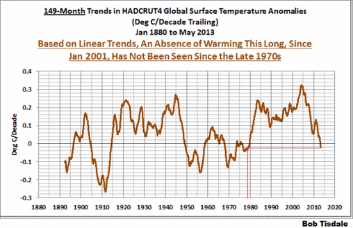 Der Zeitraum von Januar 2001 bis Mai 2013 ist inzwischen 149 Monate lang. Man betrachte Abbildung 4, also den Verlauf eines gleitenden 149-Monate-Trends von Januar 1880 bis Mai 2013, wieder mit den HADCRUT4-Daten der Temperaturanomalien. Sie wurden in gleicher Weise aufbereitet wie in der Abbildung zuvor, nur das jetzt eine Sequenz von 149 Monaten gewählt worden ist. Die höchste, auf deren linearem Trend basierende Erwärmungsrate in letzter Zeit ereignete sich während des 149-Monate-Zeitraumes, der Ende 2003 zu Ende gegangen war. Seitdem jedoch sind die Erwärmungstrends drastisch gefallen. Man beachte auch, dass Ende der siebziger Jahre zum letzten Mal ein 149-Monate-Zeitraum ohne jede Erwärmung aufgetreten war – bis jetzt.