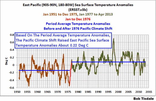 Die Pazifische Klimaverschiebung des Jahres 1976 verursachte im Ostpazifik einen Temperaturanstieg von 0,22°C. Siehe Abbildung 5! Es gibt zahlreiche begutachtete Studien über diese Verschiebung, aber keine allgemeine Übereinstimmung über deren Gründe. Die globale Temperatur rund um die Welt reagiert auf diese Verschiebung mit atmosphärischen Sattelpunkten und Fernauswirkungen.