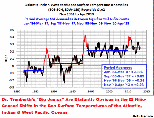 Wie ich im oben verlinkten Beitrag über Trenberths Artikel für die Royal Meteorological Society geschrieben habe – falls diese auf natürliche Weise stattfindenden, von El Niños verursachten Anstiege der Wassertemperatur für Sie neu sind, schauen Sie in mein bebildertes Essay „The Manmade Global Warming Challenge” [42MB]. Darin stelle ich eine als Einführung gedachte Diskussion der natürlichen Prozesse vor, die solche Sprünge verursachen. Im Prinzip werden diese Sprünge durch warmes Wasser verursacht, das nach starken El Niño-Ereignissen zurückbleibt – das von den El Niños erwärmte Wasser verschwindet nach deren Abklingen nicht sogleich. Der Essay enthält auch Links zu animierten Karten mit den Daten. Darin kann man das Auftreten dieser Verschiebungen erkennen und sich klar machen, woher wir von diesem übrig gebliebenen Warmwasser wissen. Am wichtigsten aber, man kann erkennen, warum man La Niña und El Niño-Ereignisse betrachten sollte, nämlich nicht als Rauschen in den Instrumenten-Temperaturaufzeichnungen, sondern als einen natürlich stattfindenden chaotischen Oszillator. Das Sonnenlicht und nicht infrarote Strahlung nimmt im tropischen Pazifik während eines La Niña zu. Das heißt, die Daten zeigen, dass die steigenden Wassertemperaturen durch die El Niños durch Sonnenlicht angetrieben wurden, nicht durch Treibhausgase. Wir besprechen dies noch detaillierter bei der Diskussion über den ozeanischen Wärmegehalt in einem späteren Beitrag.