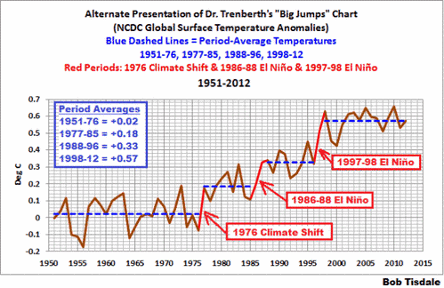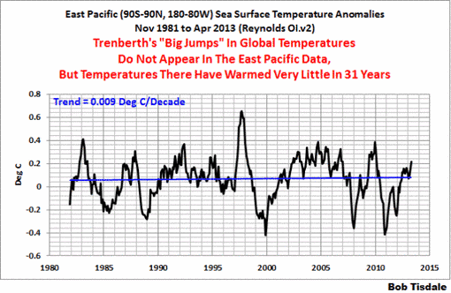 In jenem Beitrag über den Trenberth-Artikel an die RMS habe ich auch eine Graphik gezeigt, die ich die Alternierende Präsentation von Dr. Trenberths „großen Sprüngen“ genannt habe. Siehe Abbildung 8! Ich habe die Graphik im Jahre 1951 beginnen lassen, so dass die Reaktion auf die Klimaverschiebung im Pazifik 1976 im Ostpazifik sichtbar wird. Und ich habe auch die Zeitspannen verändert, um diese Sprünge zu isolieren von den Sprüngen im Zuge der El Niño-Ereignisse der Jahre 1986/87/88 und 1997/98. Die natürlichen Beiträge zum Anstieg der globalen Temperatur sind nur zu offensichtlich.