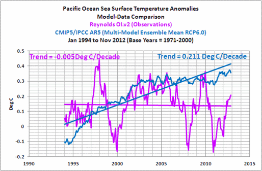 Und jüngst haben wir in dem Beitrag Meehl et al (2013) Are Also Looking for Trenberth’s Missing Heat [etwa: Meehl et al. (2013) suchen ebenfalls nach der von Trenberth vermissten Wärme] gezeigt, dass die in jener Studie verwendeten Klimamodelle keinen Beweis zeigen, dass sie in der Lage sein könnten zu simulieren, wie warmes Wasser aus den Tropen zu den mittleren Breiten des Pazifik transportiert werden könnte. Warum also sollten wir dann glauben, dass sie simulieren können, wie warmes Wasser in Tiefen unter 700 m transportiert werden könnte, ohne dass sich das Wasser der oberen 700 m erwärmt?