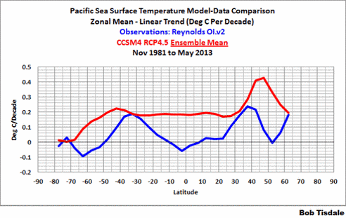 Außerdem zeigen und diskutieren wir in diesem Beitrag, wie das NCAR CCSM4-Klimamodell nicht in der Lage war, die beobachtete Erwärmung im Pazifischen Ozean während der letzten 31 Jahre zu simulieren. Siehe Abbildung 10, in der modellierte und beobachtete Trends der Wassertemperatur im Pazifischen Ozean seit November 1981 dargestellt sind, und zwar auf einer breitenabhängigen Basis (zonale Mittel). Die Tatsache, dass jene Modelle gelegentlich Jahre lange Stillstandsperioden simulieren können, ist daher unerheblich.