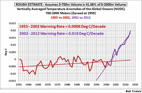 Oben habe ich dem UKMO zum Einräumen von Problemen gratuliert, die bei großen Änderungen des Beobachtungssystems auftreten, als der ozeanische Wärmegehalt für die oberen Schichten der Ozeane besprochen worden ist. Jetzt scheint es so, als hätten sie das vergessen, wenn sie die Daten bis zu einer Tiefe von 2000 Metern übernehmen. In diesem Beitrag haben wir vor Kurzem gezeigt, wie die Temperaturen unterhalb der Oberfläche in Tiefen zwischen 700 und 2000 Metern kaum einen langzeitlichen Trend von 1955 bis 2002 zeigen. Siehe Abbildung 11. Dann, kaum waren die ARGO-Bojen installiert, sind die Temperaturen dort in die Höhe geschossen. Man erinnere sich auch daran, dass die ARGO-Daten adjustiert werden mussten, um Erwärmung zu zeigen.