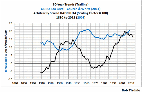 Meine Abbildung 2 zeigt die 30-jährigen linearen Trends der Temperatur und des Meeresspiegels von 1880 bis 2012. Jeder Datenpunkt in der Graphik repräsentiert die 30-Jahres-Trends in mm pro Jahrzehnt für den Meeresspiegel und Grad Celsius pro Dekade für die Temperatur, und zwar für den in jenem Jahr endenden Zeitraum. Die Temperaturdaten stammen aus den jährlichen UKMO HADCRUT4-Daten, die hier verfügbar sind. Man beachte, dass die Temperaturdaten willkürlich skaliert worden sind, indem man sie mit einem Faktor 100 multipliziert hat. Und der rekonstruierte globale Meeresspiegel von 1880 bis 2009, wie er durch Church und White (2011) beschrieben worden ist, stammt von der Website vom CSIRO hier. (CSIRO ist die australische nationale Wissenschaftsagentur). So erhalten wir die Daten der globalen Temperatur und des Meeresspiegels, wie sie vom UKMO präsentiert werden. Wie Abbildung 2 zeigt, gibt es in den 30-jährigen linearen Trends keine Übereinstimmung. Die 30-Jahres-Trends des globalen Meeresspiegels haben während der 1940 zu Ende gegangenen 30-Jahres-Perioden zugenommen, der 30-Jahres-Trend der globalen Temperatur hat jedoch von 1945 bis 1960 abgenommen.