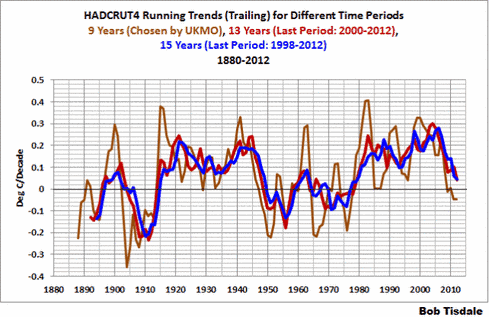 Die jährlichen Daten von 2000 bis 2012 überdecken einen Zeitraum von 13 Jahren, nicht 9 Jahre. Und die Jahre von 1998 bis 2012 überdecken 15 und nicht 9 Jahre. Es scheint, dass das UKMO 9 Jahre gewählt hat, um die Behauptung zu stützen, dass es hinsichtlich eines 9-jährigen Stillstands der globalen Erwärmung nichts Ungewöhnliches gibt. Aber um die 9 Jahre geht es ja gar nicht. Es geht um 13 Jahre und 15 Jahre. Es ist nur zu offensichtlich, warum das UKMO 9 anstatt 13 oder 15 Jahre gewählt hat. Man betrachte meine Abbildung 3. Hätte man beim UKMO 13 oder 15 Jahre als Periode gewählt, würde der gegenwärtige Stillstand ungewöhnlich aussehen; das heißt, seit Ende der siebziger Jahre haben wir keinen so geringen Erwärmungstrend mehr erlebt.