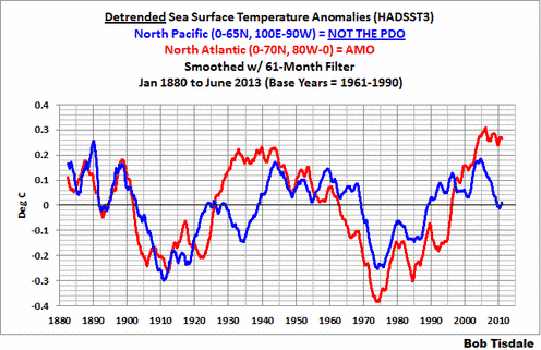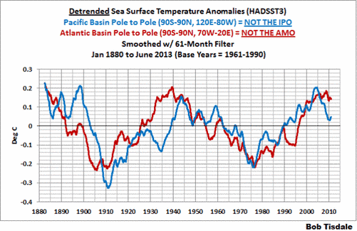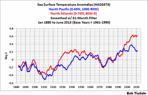 Und das UKMO ignoriert die Tatsache, dass die Wassertemperaturen des Nordpazifiks multidekadische Variationen aufweisen, die vergleichbar sind mit jenen im Nordatlantik. Das kann man leicht erkennen, wenn man die Anomalien der Wassertemperatur im Nordpazifik nördlich von 20°N trendbereinigt, und zwar auf die gleiche Weise, wie es NOAA ESRL mit dem Atlantic Multidecadal Oscillation Index macht. Meine Abbildung 4 vergleicht trendbereinigte Anomalien der Wassertemperatur im Nordatlantik (0° bis 70°N, 80°W bis 0) und im Nordpazifik (0 bis 65°N, 100°E bis 90°W). In dieser Graphik wird der UKMO HADSST3-Datensatz verwendet. Beide Unter-Datensätze wurden auch mit 61-Monate-Filtern geglättet, um monatliche und jährliche Fluktuationen zu reduzieren. (Anmerkung: Normalerweise präsentiere ich die trendbereinigten Anomalien der Wassertemperatur im außertropischen Nordpazifik {20N-65N, 100E-100W} in diesen Vergleichen, weil die PDO daraus abgeleitet ist, aber in diesem Falle habe ich den gesamten Nordpazifik {0-65N, 100E-90W} betrachtet).