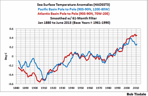Die Abkühlung im Nordpazifik erstreckt sich auf das gesamte pazifische Becken, aber die Abflachung der Wassertemperatur-Anomalien im Nordatlantik erstreckt sich nicht auf den gesamten Atlantischen Ozean. Man betrachte Abbildung 6, welche die Wassertemperatur-Anomalien im Pazifik von Pol zu Pol (90S-90N, 120E-80W) und im Atlantik von Pol zu Pol (90S-90N, 70W-20E) repräsentiert.