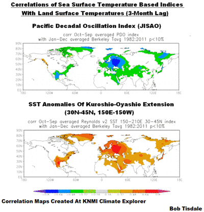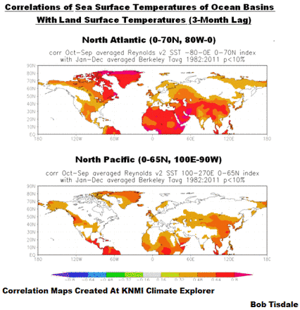 Wir können auch Karten der Korrelation benutzen, um den Einfluss der Wassertemperatur in Nordatlantik und Nordpazifik auf die Festlands-Temperaturen in der Nordhemisphäre zu illustrieren. Ich habe die Berkeley Earth Surface Temperature (BEST)-Daten in Abbildung 8 verwendet, weil CRUTEM4 räumlich nicht vollständig ist, und ich habe die Reynolds OI.v2-Daten anstatt der HADSST3-Daten aus dem gleichen Grund verwendet. Die Daten erstrecken sich von 1982 (dem Beginn der auf Satellitenmessungen basierenden Reynolds OI.v2-Daten) bis 2011 (dem letzten Jahr mit vollständigen BEST-Daten). Die obere Karte zeigt die Korrelationen der Festlands-Temperaturanomalien mit denen der Wassertemperatur im Nordatlantik, und die untere Karte das Gleiche mit dem Nordpazifik. Man kann leicht erkennen, warum Forscher glauben, dass der Nordatlantik einen starken Einfluss auf die Temperaturen in der Nordhemisphäre hat. Aber man kann den Pazifik nicht ignorieren, weil er ebenfalls Auswirkungen zeitigt.