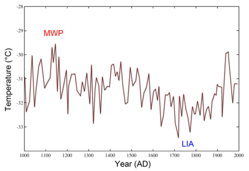 Nach der Kleinen Eiszeit, berichten sie, ist die Temperatur erneut gestiegen, dass sie jedoch „während der letzten Jahrzehnte abgenommen hat“. Dies zeigt, dass die MWP in diesem Teil der Arktis signifikant wärmer war als vor der letzten Jahrtausendwende.