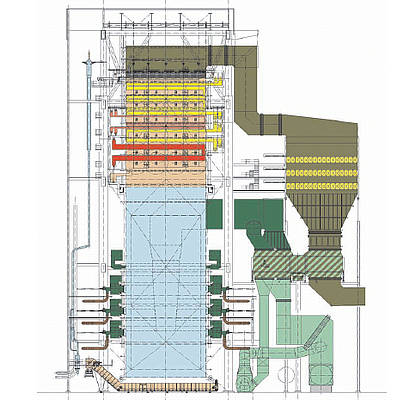 Bild 3. Schemadarstellung des Dampfkessels eines modernen Kohlekraftwerkes (Bild: VGB PowerTech Germany, Wikimedia Commons)