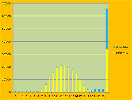 Bild 2. Erzeugung von Strom aus Wind- und Sonnenenergie in Deutschland am 22.8.2013. Ganz rechts die installierten Gesamtkapazitäten (Datenquelle: transparency.eex.com)