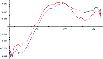 Wir erkennen, dass die Daten um den extrahierten Trend mit etwa der gleichen Amplitude von Spitze zu Spitze oszillieren, und zwar bis etwa zum Jahr 2000. Mehr zu dieser Abweichung später. Die wirklich interessante Eigenschaft des Trends zeigt sich, wenn wir auf den in Abbildung 3 gezeigten Erst-Unterschied schauen (Zeitableitung der roten Kurve in Abbildung 2):