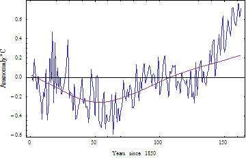 Der Klimaverlauf der letzten 163 Jahre lässt sich gut erklären als Integral 2. Ordnung als Folge eines auslösenden Ereignisses, zu dem es Mitte oder Ende der siebziger Jahre des 19. Jahrhunderts gekommen war plus einem oszillatorischen Zustand, reguliert durch die Solarstrahlung. In den hier analysierten Temperaturreihen gibt es keinen Beweis für die Hypothese, dass die Menschheit einen messbaren Effekt auf das globale Klima gehabt hätte.