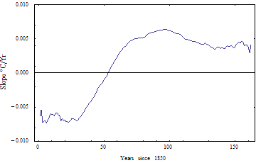 Man erkennt in Abbildung 1b, dass die Steigung des direkten Zustands innerhalb der Bandbreite von ± 1.2 °C/Jahrhundert während des gesamten Zeitraumes von 163 Jahren verharrt, wenn sie erst einmal trendbereinigt ist.
