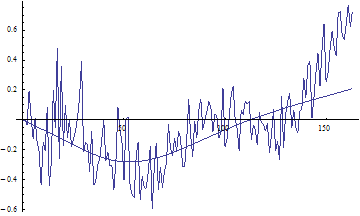Ich weiß, was Sie jetzt denken. Wir haben immer gesagt, dass der AGW-Abdruck als Stufe erscheinen würde in der Steigung der vom Rauschen befreiten Temperaturdaten, genau das also, was in Abbildung 4 erkennbar ist. Ist dass das Damoklesschwert von AGW? Wenn wir Abbildung 3 und die Rohdaten gemeinsam plotten, erkennt man das wirkliche Damoklesschwert: