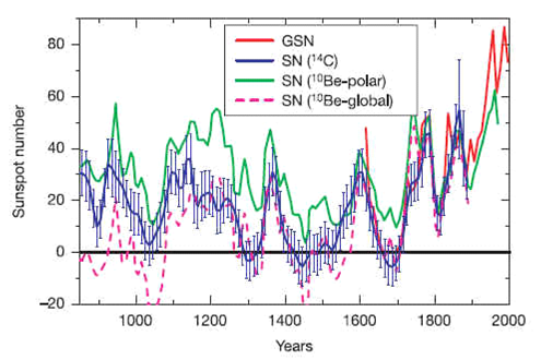 Abbildung 7: Abbildung 2 in Solanki et al. 2004: Vergleich zwischen der direkt gemessenen Sonnenfleckenzahl (SN) und der aus verschiedenen kosmogonischen Isotopen rekonstruierten SN. Geplottet ist die SN rekonstruiert aus D14C (blau) und die 10-jährig gemittelte Gruppen-Sonnenfleckenzahl 1 (GSN, rot)