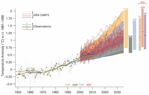 Obwohl die Modellprojektionen niemals als Vorhersagen über einen so kurzen Zeitraum gedacht waren, liegen die Beobachtungen bis 2012 allgemein innerhalb der Projektionen aller früheren Berichte.