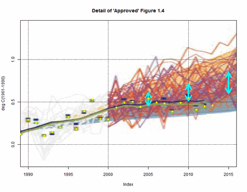 Das Ganze wurde weiter verschlimmert durch Interventionen der koordinierenden Leitautoren des IPCC (CLA, darunter vermutlich auch Marotzke und Stocker) in der Plenarsitzung (siehe hier bei Judith Curry), auf der die CLA gegen die Bekanntgabe der Inkonsistenzen zwischen Modellen und Beobachtungen in der SPM gekämpft haben – ein Vorgang, über den ich separat berichten möchte: