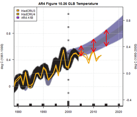 Die Einhüllende in der Abbildung der zweiten Version kann tatsächlich aus Abbildung 10.26 im AR 4 abgeleitet werden. Im nächsten Bild habe ich in die Originaldarstellung von Abbildung 10.26 die Beobachtungen hinein geplottet, so dass die Diskrepanz eindeutig hervortritt. Ich habe auch die Einhüllende der Jahre 2005, 2010 und 2015 mit roten Pfeilen markiert (die ich aus anderen Diagrammen zur Verdeutlichung verschoben habe). Es ist offensichtlich, wie sehr die Beobachtungen außerhalb der Projektions-Einhüllenden in der Abbildung im AR 4 liegen.