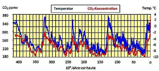Abb. 2: Die Vostok-Eisbohrkerne zeigten einen zunächst falsch gedeuteten Zusammenhang zwischen CO2-Konzentration und Lufttemperatur (nach Petit, 1999)7