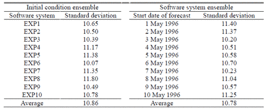 Tabelle 2: Global gemittelte Standardabweichung der 500 hPa-Fläche aus dem 10-Mitglieder-Ensemble mit unterschiedlichen Anfangsbedingungen in einem gegebenen Software-System 383 (d. h. Ensemble der Anfangsbedingungen) und der korrespondierenden Standardabweichung des 10-Mitglieder-Ensembles mit unterschiedlichen Software-Systemen für einen gegebenen Anfangszustand (d. h. Ensemble der Software-Systeme).