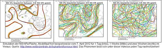 Anhang: Die in diesem Artikel angesprochene Problematik globaler Wettervorhersage-Systeme kann jeder täglich selbst nachvollziehen (und zwar hier: http://www.wetterzentrale.de/topkarten/fsenseur.html). Beispielhaft seien hier die folgenden drei Abbildungen gezeigt: