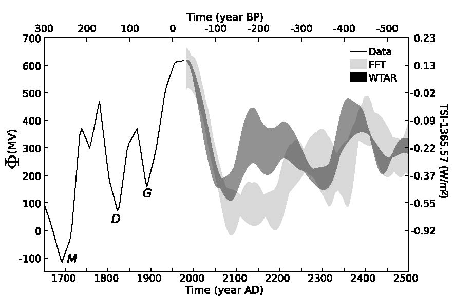 [1] F. Steinhilber and J. Beer, Prediction of solar actibvity for the next 500 years, Jor. Geophys. Res. Space Phys., Vol. 118, 1861-1867 (2013)