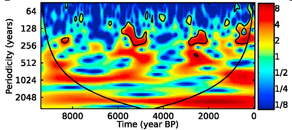 Bild 2: Waveletspektrum, die rechte Skala gibt die Stärke der Periodizität (in log2) an. Die schwarze Linie ist der "cone of influence", außerhalb von ihm werden die Ergebnisse allmählich unsicher. Der im Text erwähnte de Vries Zyklus, der in den letzten 1000 Jahre zu den stärkksten Periodizitäten gehört, ist deutlch erkennbar.