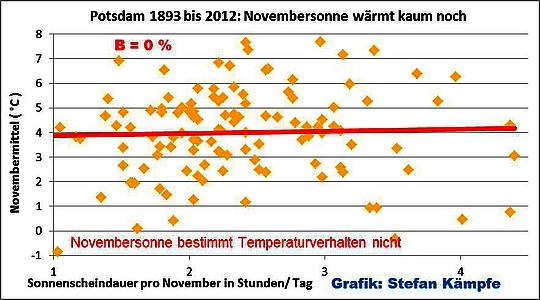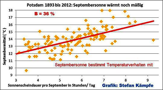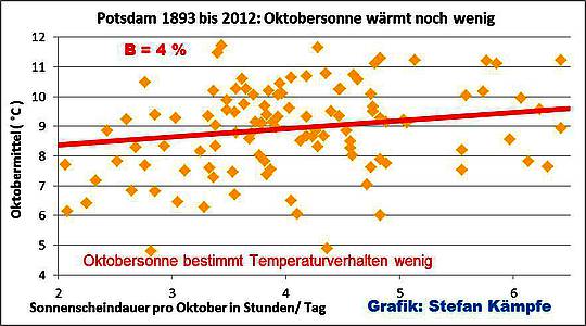 Als letzte mögliche Ursache der insgesamt gestiegenen Herbsttemperaturen bliebe noch die Sonnenscheindauer zu betrachten, welche während der vergangenen 30 Jahre in allen Jahreszeiten mehr oder weniger deutlich zunahm. In den strahlungsreichen Jahreszeiten (Frühling und Sommer) beeinflusste sie das Temperaturverhalten in Deutschland mit Bestimmtheitsmaßen von 30 bis 70% ganz wesentlich- je länger die Sonne schien, desto wärmer wurde es. Im Herbst lässt jedoch der positive Einfluss der Sonnenscheindauer auf die Lufttemperaturen stark nach; lediglich die Septembertemperaturen werden noch relativ deutlich von der Sonnenscheindauer beeinflusst (nächste 3 Grafiken; Datenquelle PIK):