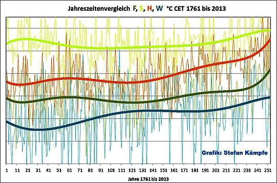 Die folgenden zwei schematischen Grafiken verdeutlichen, wie sich die Herbsttemperaturen (jeweils rötliche, zweite Kurve von oben) im Vergleich zu den anderen Jahreszeiten seit 1761 entwickelt haben. Um etwas über den deutschen „Tellerrand“ hinauszuschauen, sind in der unteren Grafik die Mittelwerte von Zentralengland (CET = Central England Temperature Records) dargestellt. Man erkennt einen erheblichen, in beiden Messreihen sehr ähnlichen, kräftigen Anstieg der Herbst- und Frühjahrstemperaturen, während die Wintertemperaturen in Deutschland stärkere, periodische Schwankungen als in England aufweisen und neuerdings in Deutschland seit über 20 Jahren wieder fallend sind. Außerdem zeigt sich in England seit kurzem ein Nachlassen des sommerlichen Temperaturanstiegs, während in Deutschland die Sommerwerte im Vergleich zu 1761 noch steigen und erst die letzten 15 Jahre eine Stagnation zeigen, die aber in der langfristigen Trendlinie noch nicht angezeigt wird.