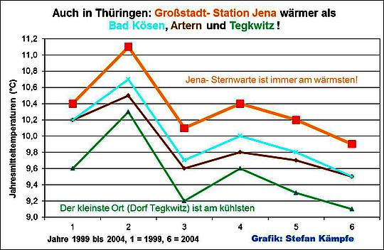 Was für Thüringen gilt, gilt natürlich auch für andere städtische Wärmeinseln in Deutschland. Düsseldorf ist immer etwas wärmer als die Station in einem Vorort von Bochum. Und wenn der DWD auf seiner homepage neue zukünftige Temperaturrekorde im Sommer ankündigt, dann gelten solche Vorhersagen immer für Städte. z.B. für München