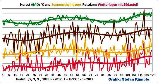 Bleiben wir aber beim Herbst. Nun bleibt noch die Frage nach möglichen Ursachen des rhythmischen Temperaturverlaufs, welcher sich auch bei den Herbsttemperaturen sowohl in Deutschland als auch in England zeigt. KÄMPFE wies 2013 nach, dass das Häufigkeitsverhalten der Großwetterlagen das Temperaturverhalten in Deutschland wesentlich mitbestimmt. Als eine mögliche Ursache für das Häufigkeitsverhalten der Großwetterlagen erwies sich die Atlantische Mehrzehnjährige Oszillation (AMO). Die nächste Grafik zeigt anhand der Werte der Säkularstation Potsdam (Quelle: PIK), dass die Häufigkeit von Großwetterlagen mit südlichem Strömungsanteil (unterste, rote Kurve), die Sonnenscheindauer (gelb), die Herbsttemperaturen in Potsdam (braun) und die AMO (grün) während der vergangenen 120 Jahre einen ähnlichen Verlauf aufwiesen; allerdings bedarf es dazu noch vertiefender Untersuchungen: