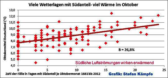 Man erkennt eine deutliche Zunahme der Großwetterlagen mit Südanteil. Und genau diese waren auch die Hauptursache für den milden Oktober 2013, der insgesamt recht sonnenscheinarm ausfiel. Im Jahresverlauf war der Einfluss der Großwetterlagen mit Südanteil auf die Lufttemperaturen in Deutschland im Oktober am größten: