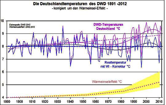 Neben Schwankungen der Sonnenaktivität (die jeweiligen Maxima des etwa 210- jährigen Hauptsonnenzyklus bilden sich in den insgesamt relativ hohen Temperaturen zum Ende des 18. und des 20. Jahrhunderts ab) sind zunehmende Erwärmungseffekte durch Besiedlung, Bautätigkeit und geänderte Landnutzung ein wesentlicher Treiber des Temperaturanstiegs gewesen. Man beachte, dass die in den obigen Grafiken gezeigten Messreihen nicht um diesen Effekt bereinigt wurden! Für Deutschland hatten KOWATSCH/LEISTENSCHNEIDER diesen Effekt für den Zeitraum 1891 bis 2012 untersucht und ihre Ergebnisse in folgender Grafik zusammengefasst: