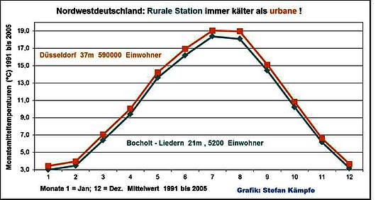 Nach diesen Untersuchungen geht der in Deutschland beobachtete Temperaturanstieg fast gänzlich auf das Konto der verschiedenen, nutzungsbedingten Erwärmungseffekte (hier der Vereinfachung halber „Wärmeinseleffekt“ genannt). Allerdings wurden bislang nur Jahreswerte untersucht. Vertiefende Untersuchungen zu den einzelnen Jahreszeiten stehen noch aus, so dass momentan noch keine Aussagen getroffen werden können, wie stark sich der Wärmeinseleffekt auf die Herbsttemperaturen auswirkte. Eine vertiefende Studie von KÄMPFE/LEISTENSCHNEIDER/KOWATSCH (2013) wies nach, dass Stationen ähnlicher Breiten- und Höhenlage immer dann deutlich wärmer waren, wenn sie nahe bei oder gar in Großstädten lagen: