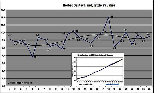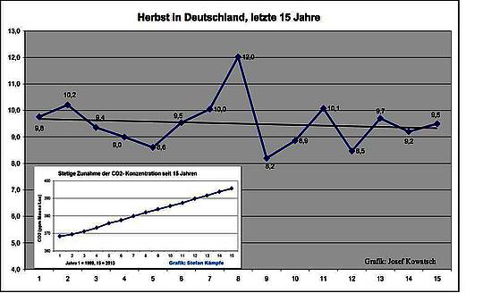 Die Station in Erfurt ist fast identisch im Temperturverhalten der letzten 15 Jahre mit den Herbsttemperaturen Deutschlands: Die CO2-Konzentrationen sind gestiegen (kleine eingeblendete Grafik), die Wirkung von CO2 scheint in den letzten 15 Jahren Herbst in Deutschland aber ausgesetzt zu haben.