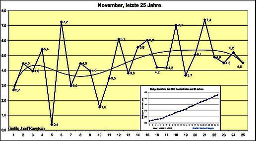 Der November zeigt über die letzten 25 Jahre einen leichten Temperaturanstieg, die letzten 12 Jahre sind stagnierend. Über den ganzen Zeitraum sind die Kohlendioxidkonzentrationen jedoch kontinuierlich angestiegen.