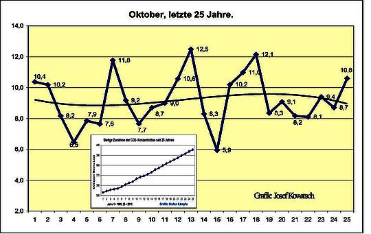 Auch der Oktober zeigt in Deutschland einen ähnlichen Verlauf wie der September. Nur der diesjährige Oktober 2013 war etwas milder als die letzten sechs Oktober der vergangenen Jahre. Deshalb ist die Polynomkurve am Schluss kaum fallend. Im ganzen Zeitraum der letzten 25 Jahre sind die CO2-Konzentration natürlich kontinuierlich angestiegen, ohne jede Wirkung auf die Temperaturen.