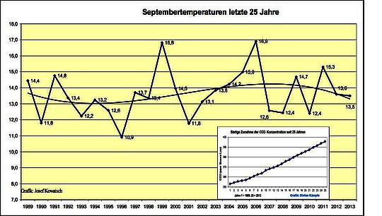 Der September in Deutschland zeigt einen ähnlichen Verlauf wie die Jahrestemperaturen in Deutschland. Es hat sich eigentlich nicht viel getan im letzten Vierteljahrhundert. Allerdings zeigt dieser Monat keine Sommerverlängerung mehr in den Herbst hinein wie man noch vor einigen Jahren hätte glauben können, die Temperaturen vom September sinken in Deutschland in den letzten Jahren. Der Leser möge die kleine eingeblendete Grafik beachten, hierin sind die steigenden CO2-Konzentrationen der letzten 25 Jahre zum Vergleich abgebildet. Keinesfalls hat nun die behauptete Erwärmungswirkung von CO2 im September ausgesetzt, diese gibt es schlichtweg nicht. Die Korrelation ist Null.