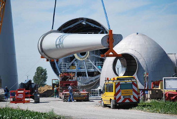 Die modernere E 126, die eine Gesamthöhe von fast 200 Metern erreicht, benötigt ein Fundament von 1.500 Kubikmetern Beton, der mit 180 Tonnen Stahl armiert ist. Auf dem runden Fundament, das 3.500 Tonnen wiegt, steht der Turm aus konischen Stahlbeton – Segmenten, der 2.800 Tonnen auf die Waage bringt. Das auf dem Turm sitzende Maschinenhaus mit Generator wiegt 340 Tonnen, die Nabe mit den Rotorflügeln aus glasfaserverstärktem Kunststoff noch einmal 320 Tonnen
