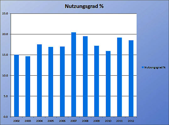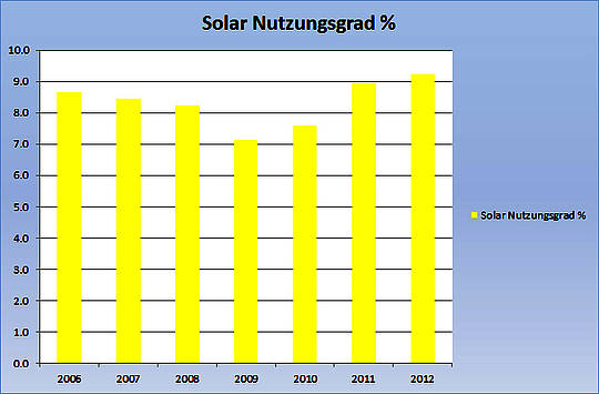 Bild 3. Durchschnittliche Nutzungsgrade der in Deutschland installierten Fotovoltaikanlagen in den Jahren 2006 – 2012 (Daten: BMU [AEEE])