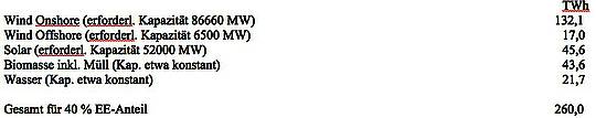 Per 3. Dez. 2013 waren in Deutschland 32460 MW Windkapazität sowie 34850 MW Solarkapazität installiert [EEX], ausserdem etwa 500-700 MW Offshore-Kapazität. Um die obigen Werte für die Jahres-Stromproduktion zu erreichen, wäre demnach folgender Zubau erforderlich: