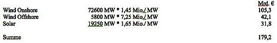 Allein für die reinen Anlageninvestitionen kommen mit den EE-Plänen der neuen Regierung somit auf den deutschen Verbraucher zusätzliche Kosten von ca. 180,- Mrd. € zu.