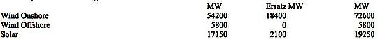 In obiger Rechnung wird auch der Ersatzbedarf für diejenigen Kapazitäten berücksichtigt, die aufgrund des Erreichens der Altersgrenze ausgemustert werden müssen, d.h für alle Anlagen, die 2005 bereits in Betrieb waren. Bei Solaranlagen sind dies lediglich 2100 MW, bei Windenergieanlagen jedoch immerhin zusätzlich 18400 MW.