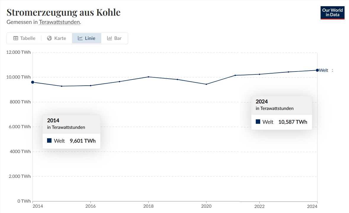 Von 2014 bis 2024 hat Kohlestrom weltweit nur um +986 TWh zugelegt, in 10 Jahren