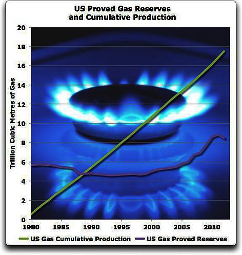 Abbildung 2: Ein Vergleich der jährlichen Schätzungen der in den USA nachgewiesenen Gasreserven (rote Linie) und der kumulativen Gaserzeugung der USA (grüne Linie) für den Zeitraum 1980 bis 2012. Daten: 2013 BP Statistical Review of World Energy.