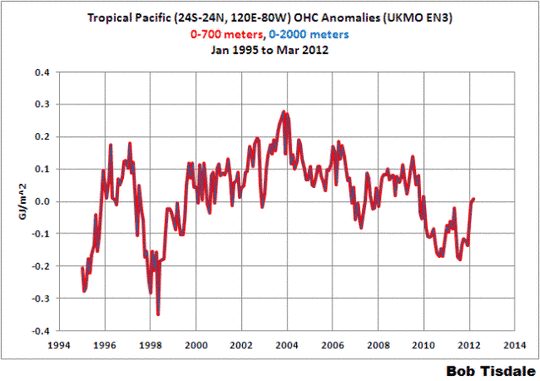 Wie Sie sehr wohl wissen, haben die Bojen des TAO-Projektes im tropischen Pazifik seit Anfang der neunziger Jahre Wassertemperaturen unter der Oberfläche gemessen, so dass man die NODC-Daten von dort als zuverlässig ansehen kann. Während des vorigen Jahrzehnts haben die ARGO-Bojen die TAO-Bojen verstärkt. Und die Daten des ozeanischen Wärmegehaltes im tropischen Pazifik in Tiefen zwischen 0 und 700 m bzw. 0 bis 2000 m während des TAO-Projektes und der ARGO-Ära sind genau gleich, wie Abbildung 2 zeigt. Das zeigt, dass die gesamte Variabilität im Wärmegehalt des tropischen Pazifik in den oberen 700 m stattfindet.